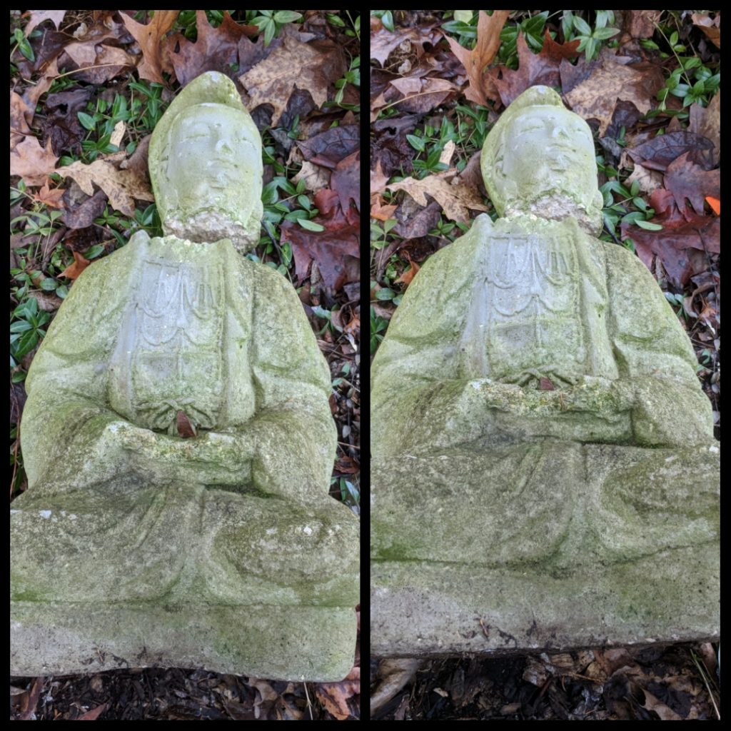 I live in a conservative, wealth-obsessed town full of drunk college kids, and at the moment I saw the statue it was pretty easy to hate this town. That’s not a particularly Buddhist attitude, but it was my honest reaction. It’s been about 20 minutes and I’m back home, sweaty from the walk, but writing before the emotions pass, which they will. I was thinking I might knock on the door of the house with the statue and offer to help them get it fixed, as a way to turn this into something positive.