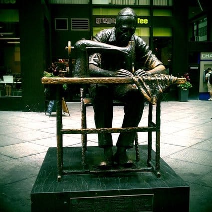 On June 1, my girlfriend accompanied me to the Port Authority Bus Terminal, where I boarded a Greyhound for Wilmington, DE. I stayed with Jill for a few days and had a great time with her and her partner, Matt. I also interviewed the guitarist Judith Kay. Then I went to State College to spend a couple days with the boys before heading south. I ended up doing an interview there, too, because Barry Kernfeld, the editor of the New Grove Dictionary of Jazz, lives in town. On the 5th I went to Shepherdstown, WV, where I gave a poetry reading and interviewed Jeff Cosgrove. On the 7th I went to Washington, DC. I attended a tribute to the poet Gwendolyn Brooks at the Library of Congress and met poet Sandra Beasley, whom I subsequently interviewed at a nearby coffee shop. I was also briefly naked in the Library of Congress because I was very overdressed and stripped down in the men’s room so I could put on cooler clothing. Certainly a career highlight for me. While in DC I did a freelance interview for an education company, and jazz interviews with several musicians. I saw a show by saxophonist Brian Settles. On the 10th I went to Richmond, VA, where I stayed with drummer Scott Clark and then with guitarist Scott Burton. I interviewed both of them, too, as well as educator Doug Richards. I read poetry at Chop Suey Books and saw a show by Janel & Anthony, who were kind enough to come to my reading. On the 14th I traveled to Charlottesville, WV, where I met my Twitter pal John Mason and heard John D’earth play at the club that launched Dave Matthews’ career. I was interviewed on WTJU and I did two interviews for my show, too. On the 16th I took a long bus ride to Nashville. I did a poetry reading there the following day and conducted several interviews, including with Jeff Coffin, saxophonist for the Dave Matthews Band. I spent most of my time with Jeff and fellow saxophonist Evan Cobb, who has a great dog. I heard the Nashville Jazz Orchestra perform and saw fantastic shows by The Time Jumpers and the comedy/country team Doyle And Debbie. I did another radio interview, too. On the 20th, I went to Knoxville, TN, where I interviewed pianist Donald Brown. I also took a canoe trip on the Little River and did a poetry reading. On the 23rd I took an insane bus trip from Knoxville to NYC to see my girlfriend. Then on the 26th it was back down south, this time to Raleigh to meet Twitter pal David Menestres. From there it was on to Atlanta, where I interviewed jazz organist Matthew Kaminski at his day job – as the organist for the Atlanta Braves. On the 29th I traveled to Auburn, AL, at the suggestion of Twitter pal Patrick McCurry. I did a poetry reading at The Gnu’s Room bookstore on the 29th and was interviewed there for public radio on the 30th. Little did I know the role Auburn would play in my future.